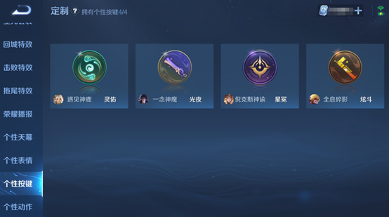 4款皮肤有专属的个性按键,分别是1.武则天的倪克斯神谕-星冕,2.孙悟空的全息碎影-炫斗,3.瑶的遇见神鹿-灵佑,4.李信的一念神魔-光夜。