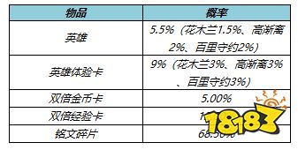 打开后可随机获得以下奖励之一:花木兰、高渐离、百里守约、英雄体验卡3天、双倍金币卡:1日、双倍经验卡:1日、188/138/108铭文碎片。