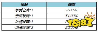 购买红蓝对决(1日),可额外随机获得以下之一:挚爱之言*1、亲密玫瑰*1、浓情玫瑰*1、浓情玫瑰*2。累计20次至少可获得挚爱之言*1。