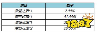 购买红蓝对决(1日),可额外随机获得以下之一:挚爱之诺*1、亲密玫瑰*1、浓情玫瑰*1、浓情玫瑰*2。累计20次至少可获得挚爱之诺*1。