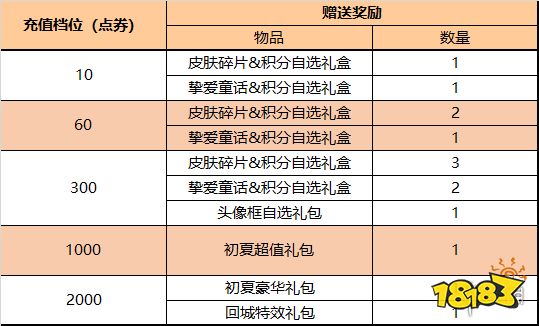 初夏超值礼包:打开礼包可任意选择以下奖励之一:铭文碎片*600、战令币*40、战令经验*2000