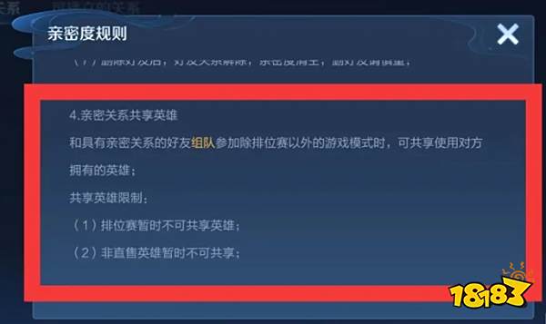 王者荣耀共享英雄规则机制介绍:王者荣耀好友之间共享英雄方法是,需要在好友双方建立亲密关系,而亲密关系的建立最低则需要有100的亲密度,才可以共享英雄。