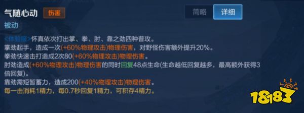 肘劲造成(+60%物理攻击)物理伤害的同时回复48点生命(生命越低回复越多,最高额外获得3倍回复)。