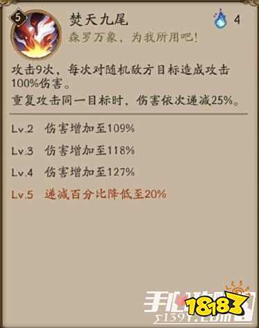 焚天九尾:攻击9次,每次对随机敌方目标造成攻击100%伤害。重复攻击同一目标时,伤害一次递减25%。
