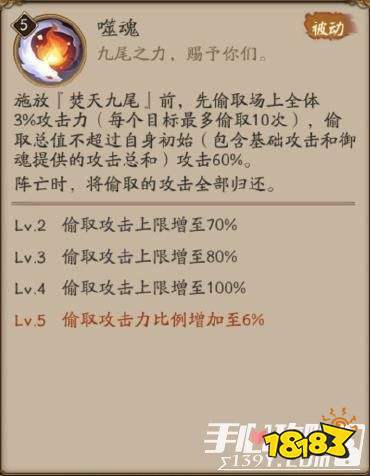 噬魂:施放【焚天九尾】前,先偷取场上全体3%攻击力(每个目标最多偷取10次)