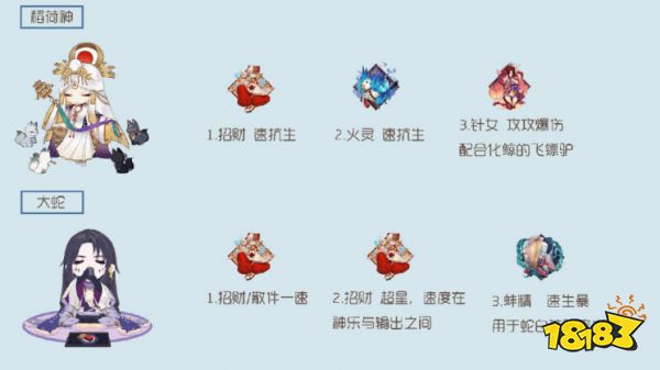 三波流大蛇(招财或其他,速度卡在输出和神乐之间):用于铃/吞辉起手的速攻队,拉云外镜、茶几、鬼童丸等。