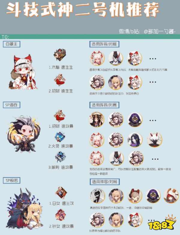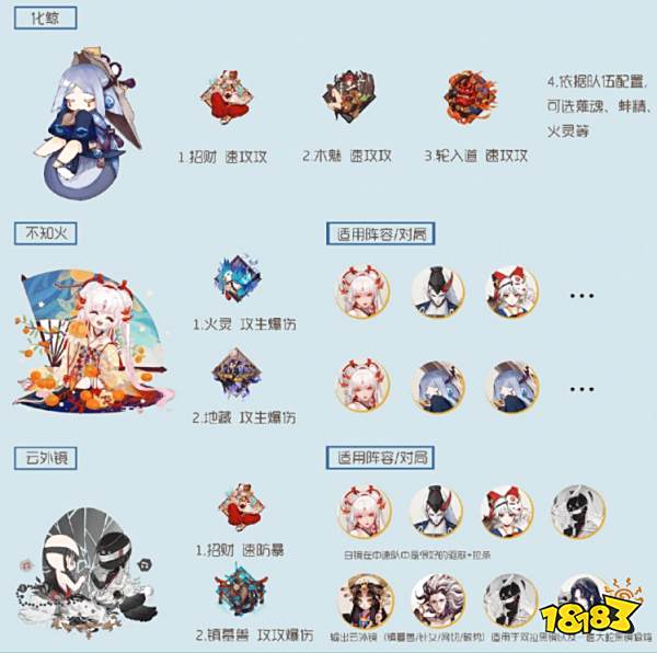 日女般若(速、生、攻):常用于永动机队、针对速攻队的反打中速队、离久内战或者三波流速攻队中的辅助位;