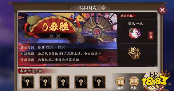 玩法规则:与队友共同开启挑战,用随机生成的式神构建大人们的队伍,用于在全自动战斗的系列赛中取得尽量高的胜场,赢取对应的奖励。具体规则请于维护后前往游戏内查看。