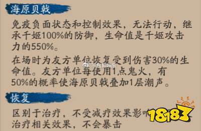 海原贝戟:召唤物,免疫负面状态和控制效果,无法行动,继承千姬100%的防御,生命值是千姬攻击力的550%。作为召唤物存在时,友方单位恢复受到伤害30%的生命值。
