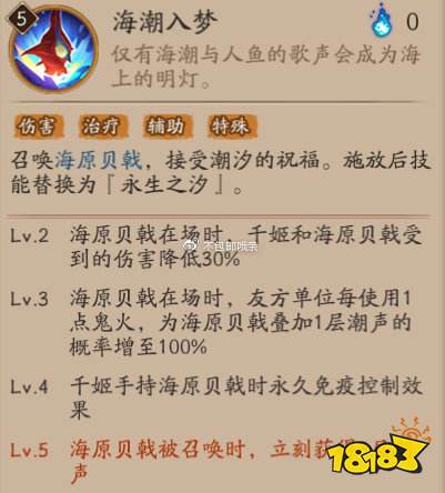 海潮入梦:0火消耗,召唤技能。将手中的海原贝戟变成召唤物,并将技能替换成永生之汐。海原贝戟作为召唤物时,千姬和海原贝戟受到的伤害降低30%。友方单位每使用1点鬼火,海原贝戟增加1层潮声。海原贝戟被召唤时立刻获得3层潮声。当海原贝戟没被召唤,作为千姬手中武器时,千姬永久免疫控制效果。