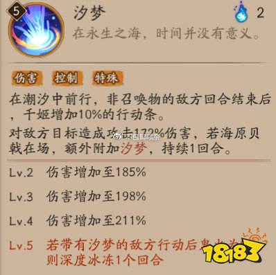 主动效果:对指定敌方目标造成伤害。若海原贝戟在场,则对目标附加汐梦,持续1回合。若带有汐梦的敌方行动后鬼火为0,则深度冰冻1回合。