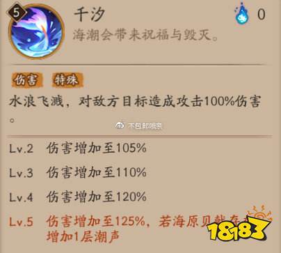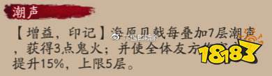 潮声:增益印记,不可驱散。海原贝戟每叠加7层潮声,获得3点鬼火;并使全体友方伤害永久提升15%,上线5层。