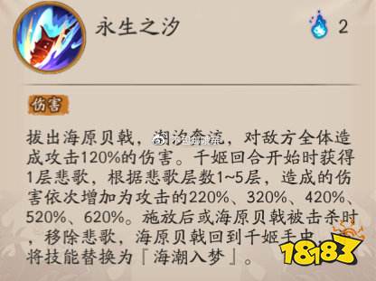 永生之汐:2鬼火消耗,输出技能。将作为召唤物的海原贝戟召回作为武器,对敌方全体打出群攻伤害。千姬回合开始时获得1层悲歌,每层悲歌增加100%群攻伤害,上限5层。施放后或海原贝戟被击杀,移除悲歌,海原贝戟变成武器形态,技能替换为海潮入梦。