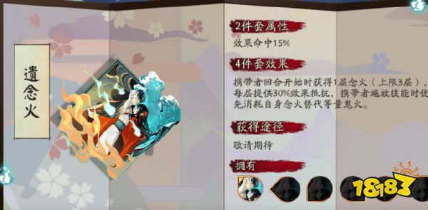 四件套效果:携带者回合开始时获得1层念火(上限3层),每层提供30%效果抵抗,携带者施放技能时优先消耗自身念火替代等量鬼火。
