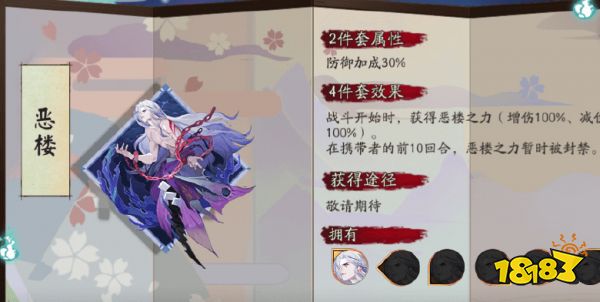 4件套效果:战斗开始时,获得恶楼之力(增伤100%、减伤100%)。在携带者的前10回合,恶楼之力暂时被封禁。