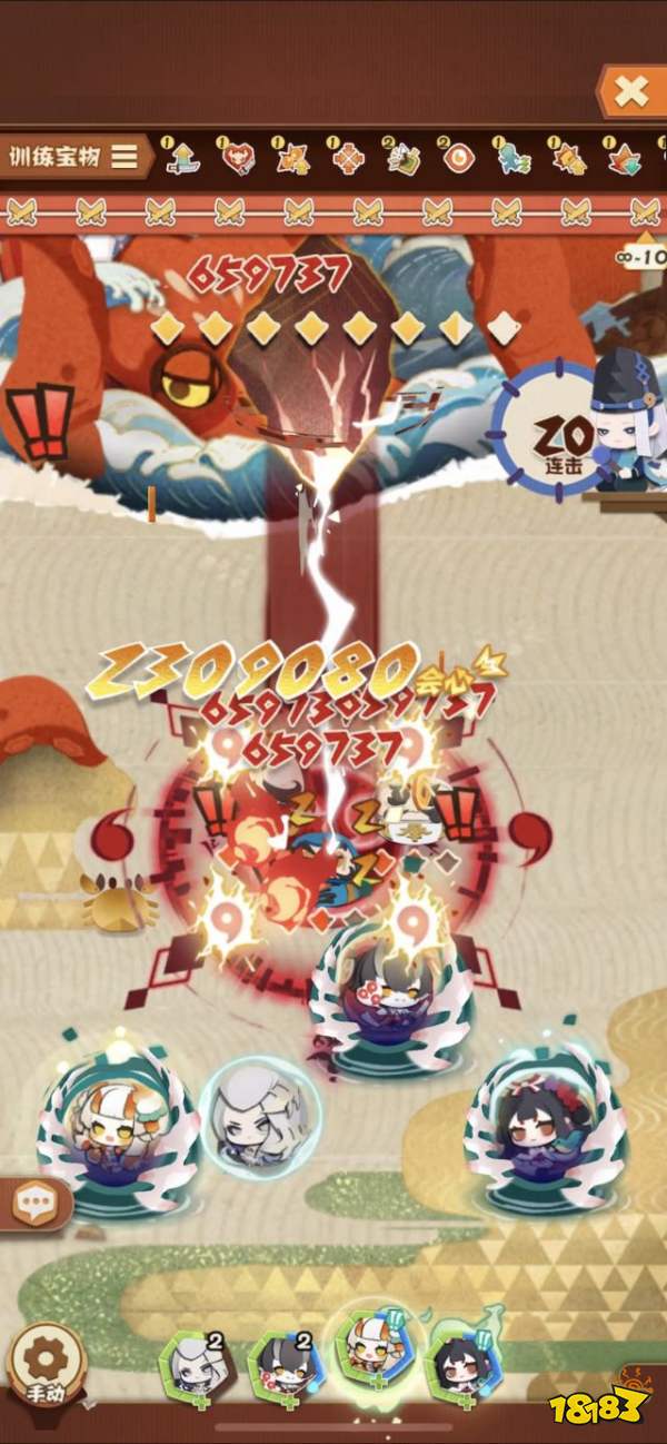大岳丸和蟹姬起手能秒小怪,因为有首撞聚怪位置选的好能一个技能一波怪。无限关后面起手有boss的直接一轮动完暴击就死了…大岳丸第一下aoe暴击200w左右,次回合一动能炸350w(我的大岳丸2勾还是璀璨硬上的,不说了)蟹姬本来技能范围很小但是配合聚怪效果拔群,暴击有100~200之间非常暴力。