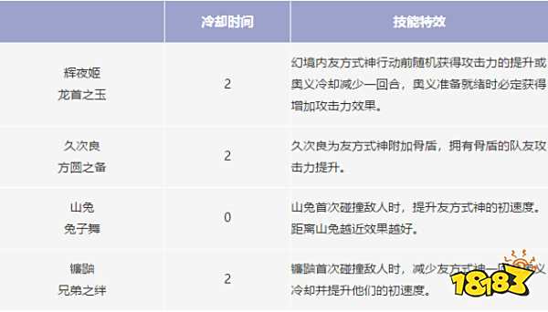 辉夜姬奥义强化Lv.1:幻境内,每个友方式神(不包含辉夜姬自身)行动前随机获得原有的加攻效果或奥义冷却减少1回合的效果(各50%概率)。如果奥义已准备就绪,则必然获得增加攻击力的效果。 辉夜姬奥义强化Lv.2:幻境延续到辉夜姬行动3次后消失 。