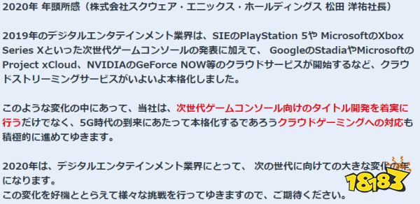 ·松田洋祐2020年问候感言:纵观2019年的数字娱乐界,索尼的PS5以及微软的Xbox Series X新世代主机陆续公开,而谷歌的Stadia、Microsoft的Project xCloud以及NVIDIA的GeForce NOW等云游戏服务系统也陆续上线,可以说业界迎来了重大的变革。