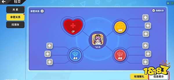 目前,游戏中可建立的亲密关系有【拍档】、【闺蜜】、【基友】和【CP】。