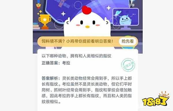 以下那种动物拥有和人类相似的指纹,支付宝蚂蚁庄园每日一题题目已经出来了,答对了就可以得到180点小鸡饲料奖励,还不知道答案的小伙伴们,下面一起来看看正确答案吧