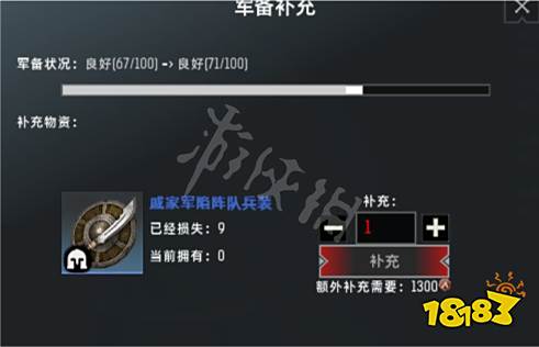 第一种直接用战火币购买,也是前期最常用的方法;在军营中,点击兵团便可以进入军团详情界面,在详情的最下栏会显示现有兵团的军备状况,点击+号即可进行补充(如果你有相应的物资便直接点击补充即可),如果没有物资,也不用担心,可以点击补充旁边的+号进行补充,但是会消耗战火币(战火币通过各色玩法赚取)。