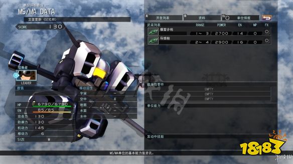 选中时按下X键就能查看机甲详细性能以及武装情况。