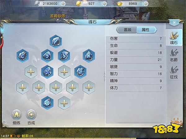 6、点击左下角“合成”按钮,可以将魂石进行合成,特定组合的三个种类魂石在加上特殊的道具,可以合成更为高级的魂石,增强人物属性。