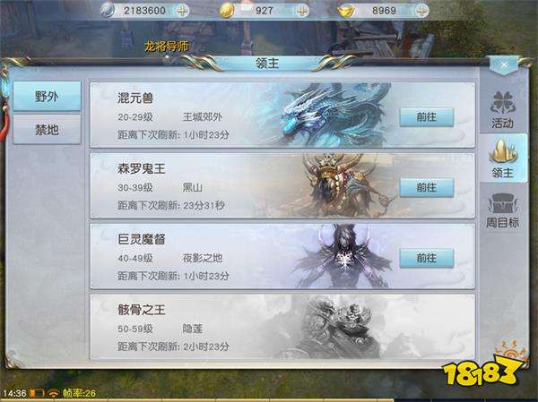 5、点击右侧的“领主”按钮,可以查看当前存在的“领主”BOSS信息:如“等级”“所在位置”“距离下次刷新时间”等;、点击前往即可快速定位至“领主”处进行击杀;