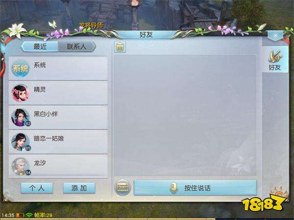 玩家通过点击主界面右下角的“好友”按钮,可以查看自己的好友信息;在此界面中,左侧点击好友头像,便可以在右侧对话框中输入想说的话;