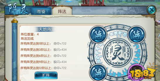 阵法一开始是需要三个阵灵组成的,我们可以人工进行扩阵,增加至4个、5个。但是一定要注意,如果扩阵至4个你就需要4个阵灵才能激活阵法,扩阵至5个就需要5个阵灵,所以我们一定要先获得阵灵再扩阵阵法。