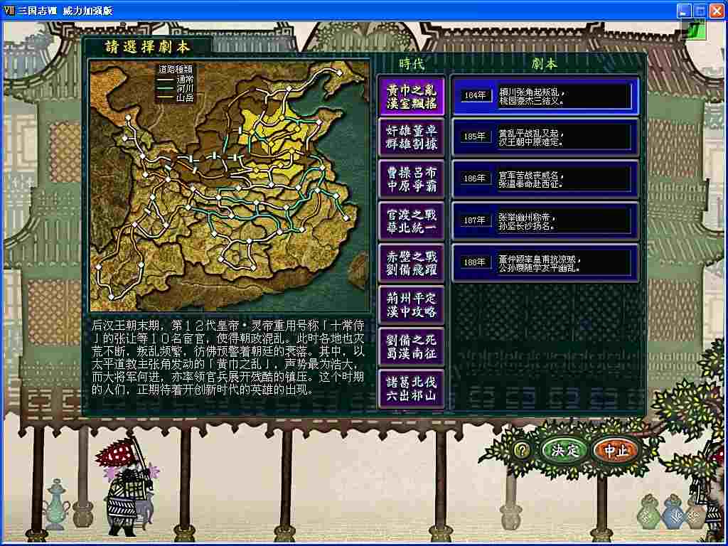 三国8的剧本从184年的黄巾之乱到234年的孔明谢世,横跨三国时期51年。可自由选择全武将,全时代。(终于可以自由选择任意一个从发布的资料上来看,居然可以玩到290年,哇!不知道还有几个名将能活得下来!)以及背景时代的说明,和著名战役的讲解,并伴随有150种历史事件的出现,象「桃园结义」、「千里走单骑」、「官渡之战」等著名历史事件将以动画的形式展现在玩家面前。让玩家更加贴近了三国时代