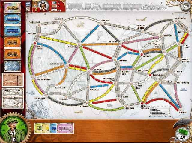 游戏的棋盘上有许多颜色的铁轨,空白的可以用任意的车厢牌来填充,而有颜色的则需要限定颜色的车厢卡或万能的火车头卡填充,填满后这一段铁路就会被属于你颜色的车厢所取代,代表你建立了这一条铁路。根据你抽取的线路卡,连接线路卡上所标示的两个城市,就建立了一条火车线路。在你的回合也可以选择抽取火车线路卡,抽三张然后至少选择一张,完成的线路越多,获得的分数也越高,但是如果线路卡在游戏结束时没有完成则会扣掉分数。