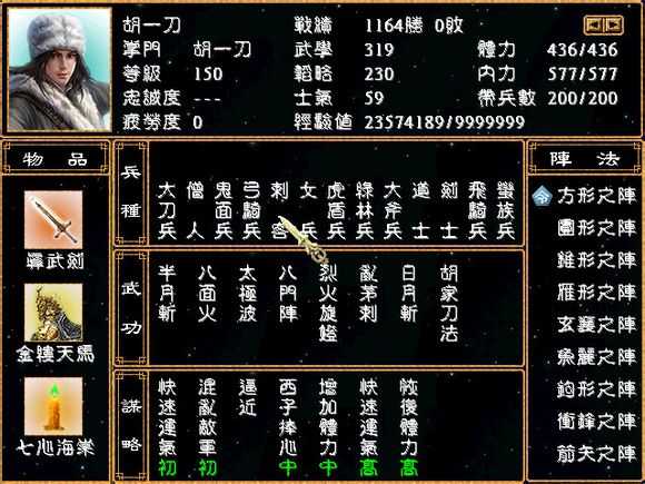 5、人物:1、军师级人物中香香公主是后期收降的。据说是第一劝降高手。试了几下,没有收降一人,劝降率个人游戏中感觉偏低。后来干脆打酱油,不用她了2、程灵素在游戏中可以说是非常强的一员军师级战将,首先就是降武,降到敌方将领武技各20了呀,还怎么跟我PK?好吧,如果机率没有降到武也行,在与敌方交战时最后大技回血也不得了,回血基本上是100~200血左右;基本上用她可以处于不败。游戏中我一般用她作为主力参战。