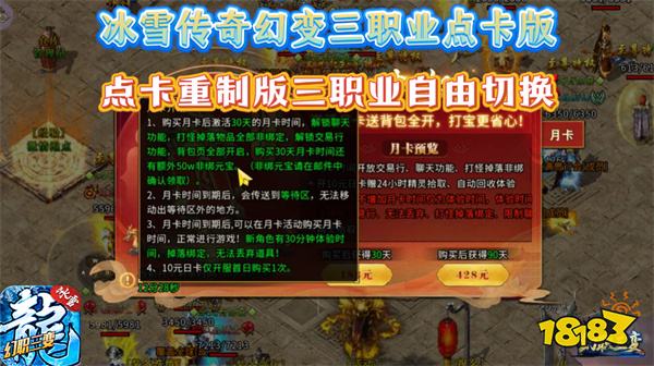 本作是冰雪系列中少数支持三职业自由切换的打金服,通过“职业幻变系统”实现一套装备适应不同职业,且采用纯时间付费模式,不售卖影响强度的数值道具,兼顾了散人多开与高端玩家挑战的需求,适合喜欢灵活搭配玩法的用户。该服同样仅设月卡与季卡两种付费方式,至尊月卡188元/30天,附赠启动元宝、自动拾取及高爆率加成等权益,可显著提升前期效率;至尊季卡428元/90天,平均每月成本更低,适合打算长期参与的玩家。新手建议从月卡开始体验。