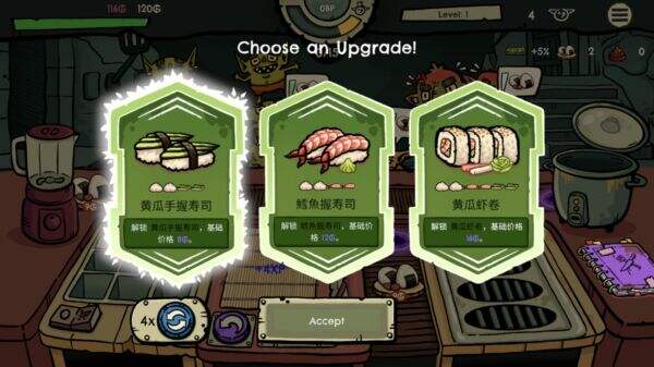 3. 升级与卡牌构筑:每完成一定数量订单会积累进度条,满条后触发升级选单。系统随机提供三张能力卡牌,包含新食谱解锁、设施增益、诅咒效果等,构筑你的专属经营流派。