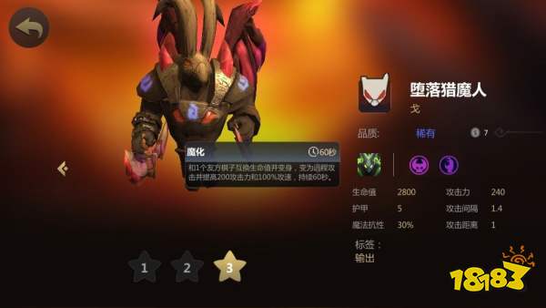 场上有1个猎魔人职业的棋子时,此棋子视为敌方的一种恶魔(也就是可以破坏敌方恶魔的buff加成效果)