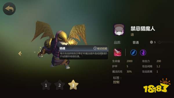 技能是普攻会削掉敌方棋子的蓝量,基本可看做无限单体沉默,前期就是各种哥布林的克星,后期必追3星,因为2星的禁忌猎魔人后期站不住2秒打不出克制效果,后期及其需要站位细节去克制敌方大招
