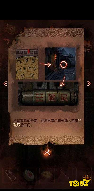 纸嫁衣4罗盘转法攻略:首先玩家需要在走廊使用罗盘,旋转罗盘将指针与红点对其,和红线排成的一行文字和八卦就是罗盘最初的揭秘线索,根据这个罗盘解谜线索,可以在风水室门锁处输入密码,密码就是【八卦方位如图、破、辰】,最后即可开门。