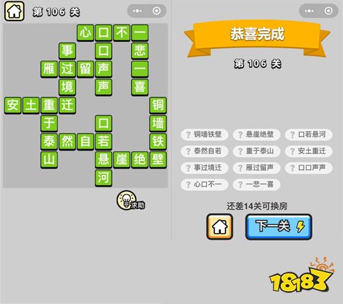 以上就是由18183小编为大家带来的成语升官记第106关答案介绍。希望能帮助到大家,祝大家游戏愉快!
