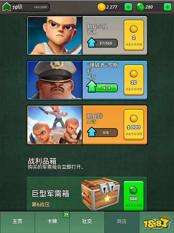 游戏内买买买的地方,这里可以进行各类充值行为,也能用宝石兑换金币和购买军需箱。其中的卡牌商店每天都会随机刷新你现在可以解锁的普通、稀有、史诗卡各一种,花费金币来购买。