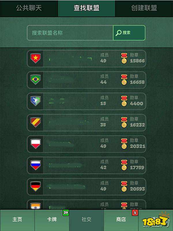 这个界面需要你的账号等级达到3级才会解锁,包含公共聊天、查找联盟、创建联盟三个选项,不过当你加入了一个联盟之后就只有公共聊天和我的联盟两个选项了。加入联盟以后有两个很大的好处,就是协助训练和联盟军需箱,这两个都是对萌新发展帮助很大的功能。