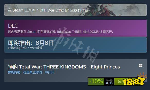 八王之乱是全面战争三国最新的dlc,该dlc将会在8月8日正式上线。dlc原价为40元,现在正处于预购阶段,并且还有9折的购折扣,就需要36元就可以入手啦。