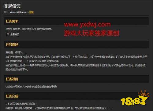 任务要求玩家前往冬泉熊怪和费伍德之间的路上寻找冬泉信使。