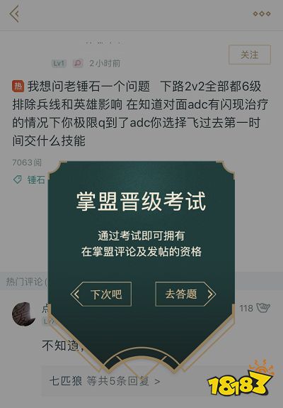 3、玩家随机点击一个盟友说的内容,随后点击评论,之后会跳出掌盟晋级考试。