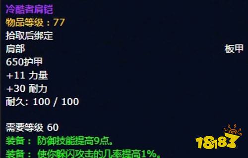 装备属性:650护甲,+11力量,+30耐力,装备效果 防御技能提高9点,使你躲闪攻击的几率提高1%。