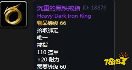 16、沉重的黑铁戒指:戒指2,熔火之心副本萨弗隆先驱者,鲁西弗隆,基赫纳斯,沙斯拉尔均可掉落,无法附魔。