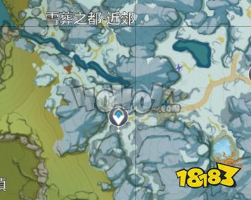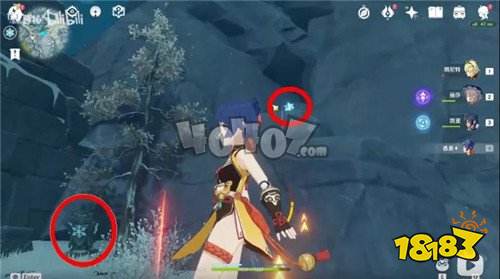 在入口之处我们能够看到周围有着四个冰元素的柱子,激活着四个冰元素的柱子即可激活这个开关,第一个在这面墙壁的最上方,第二个和第三个分别在墙壁后面以及半山坡上面,最后一个河的对面,用冰元素的角色激活这四个机关,能够看到水位会下降。这里也有着一个锁着仙灵的机关,将这个机关开启之后,能够重置我们的抗寒机制。