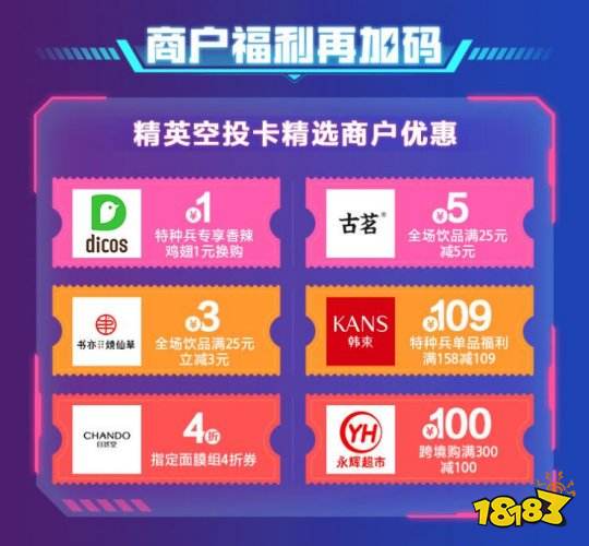 为了让特种兵真正体验到“生活处处有空投”,“和平人生精英空投卡”联合众多商户提供吃喝玩乐生活福利,还有精英空投卡精选商户提供惊喜优惠,开卡即享德克士(dicos)1元换购“特种兵专享香翅”、永辉超市“跨境购满300减100”、自然堂(CHANDO)“指定面膜组4折券”、韩束(KANS)“特种兵单品福利满158减109”等众多优惠!