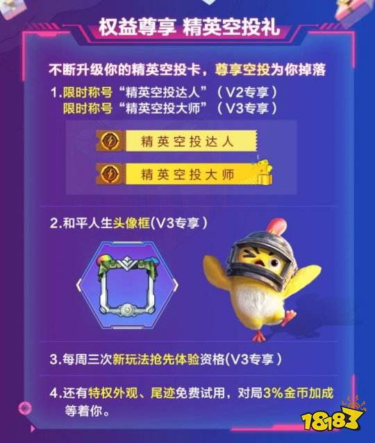 此外,还有机会获得专属特殊权益——游戏内限时称号“精英空投达人”、“精英空投大师”、“和平人生头像框”、“每周3次新玩法抢先体验资格(新模式玩法开房间体验等)”、“特权外观”、“特权尾迹”、“对局3%金币加成”等惊喜福利!