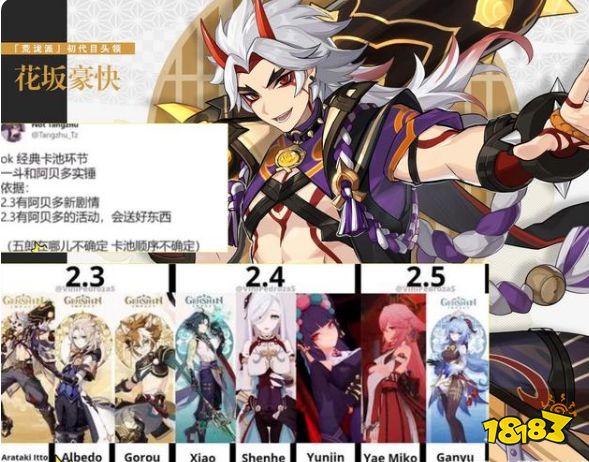 根据内鬼玩家晒出的消息图来看,2.3的第一个卡池是荒泷三斗,第二个是阿贝多。2.4的海灯节会开三个卡池,分别是魈,神鹤和云堇。而甘雨到2.5才复刻,并且还排在了八童神子的后面。